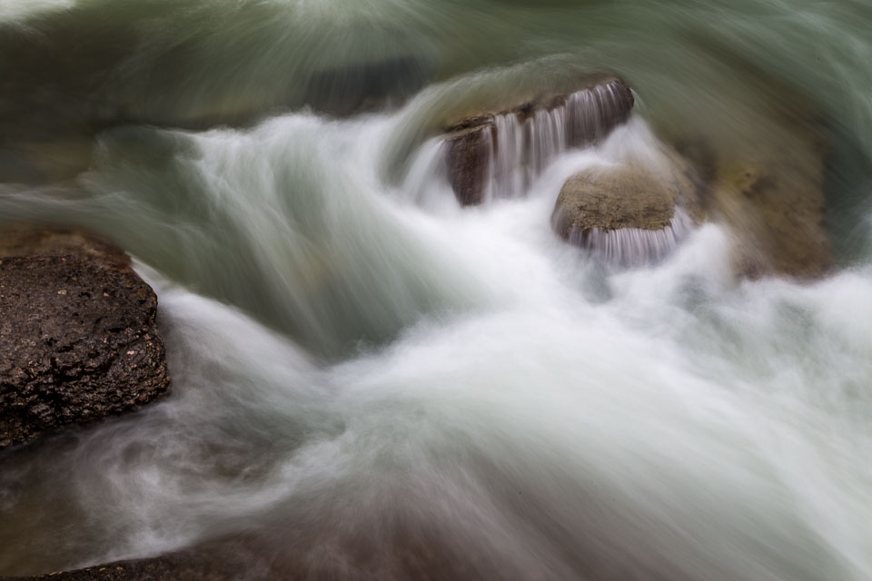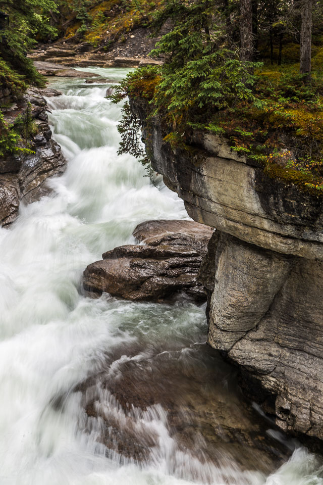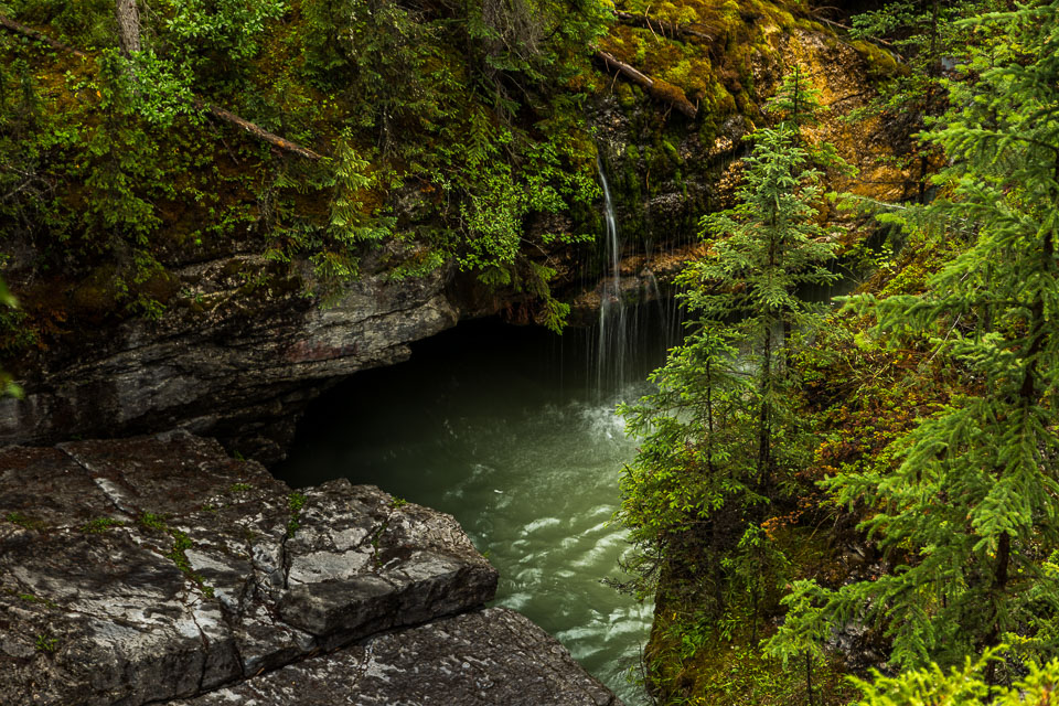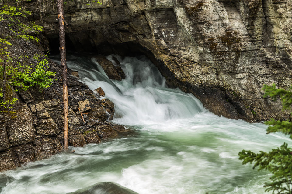 Flowing out of Medicine Lake, the Maligne River flows about 15 kilometers upstream as a full size river, but very quickly disappears into seeps in the ground and completely vanishes from the surface not far from the lake for most of the year. The smaller streams that feed the valley below that point rebuild the river by the time it reaches the top of the canyon. As the river drops down into the canyon it intersects the bedrock layers where the underground waters flow. Numerous large underground streams join and greatly increase the flow.