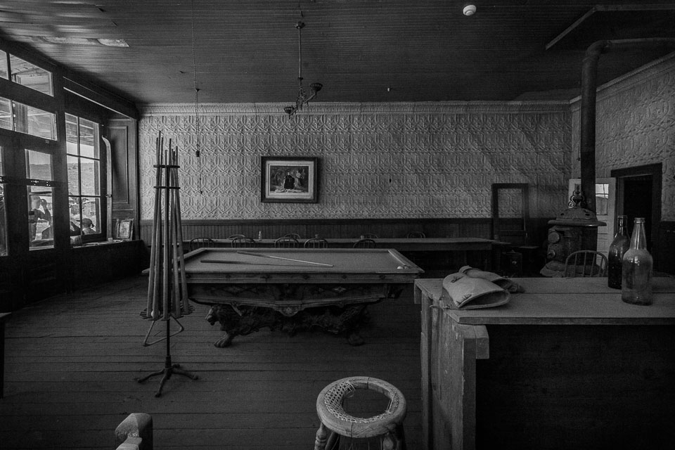 Bodie is a ghost town in the Bodie Hills east of the Sierra Nevada mountain range North of Mono Lake. A California State Historic Park, Bodie is a genuine California gold-mining ghost town. It is currently preserved in a state of "arrested decay". Interiors remain as they were left and stocked with goods. It was apparently so expensive to frieght goods out by wagons during the boom, the people just abandonded anything they could not carry. At it's height from 1877-1880, 7000 people lived there. By 1900, less than 1000 people were there, by 1920 ony 120. 170 of more than 2000 buildings remain. there is much more info on the wikipedia page.