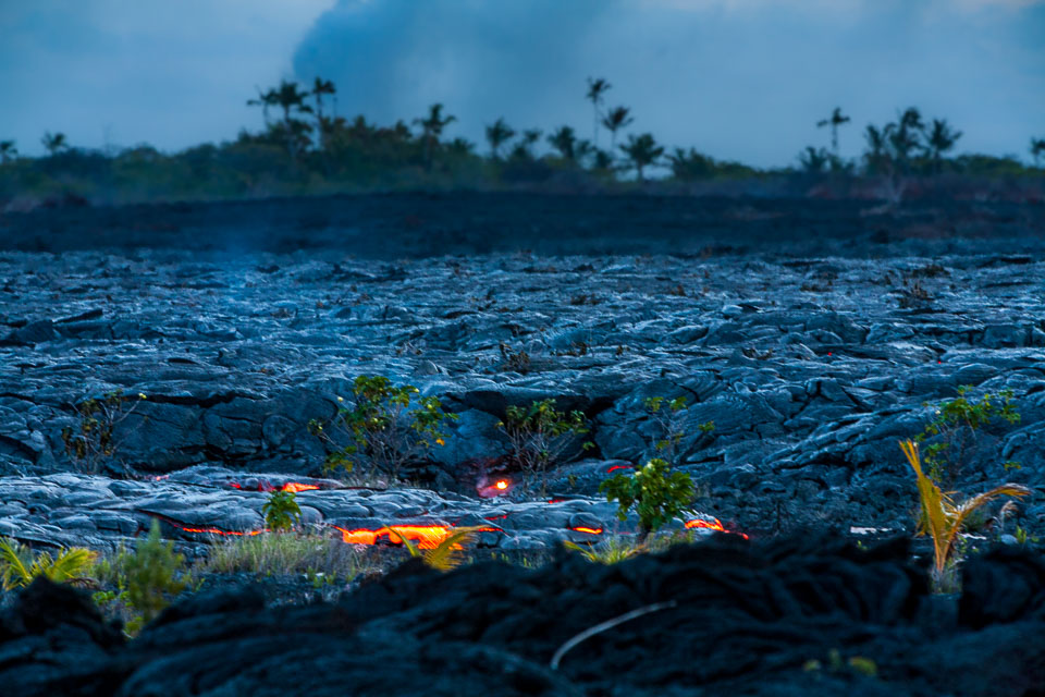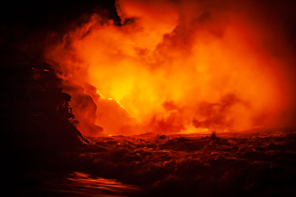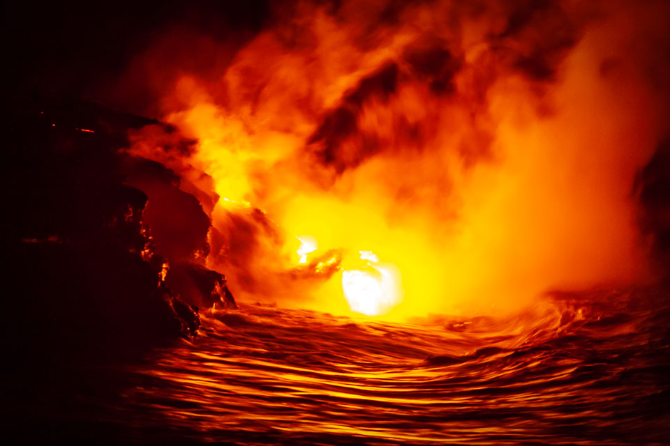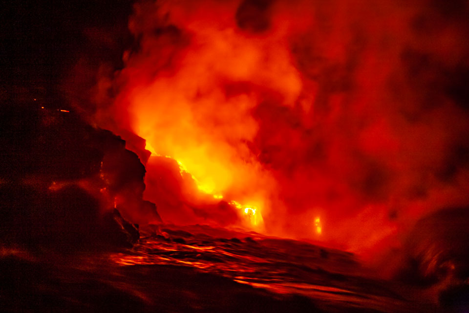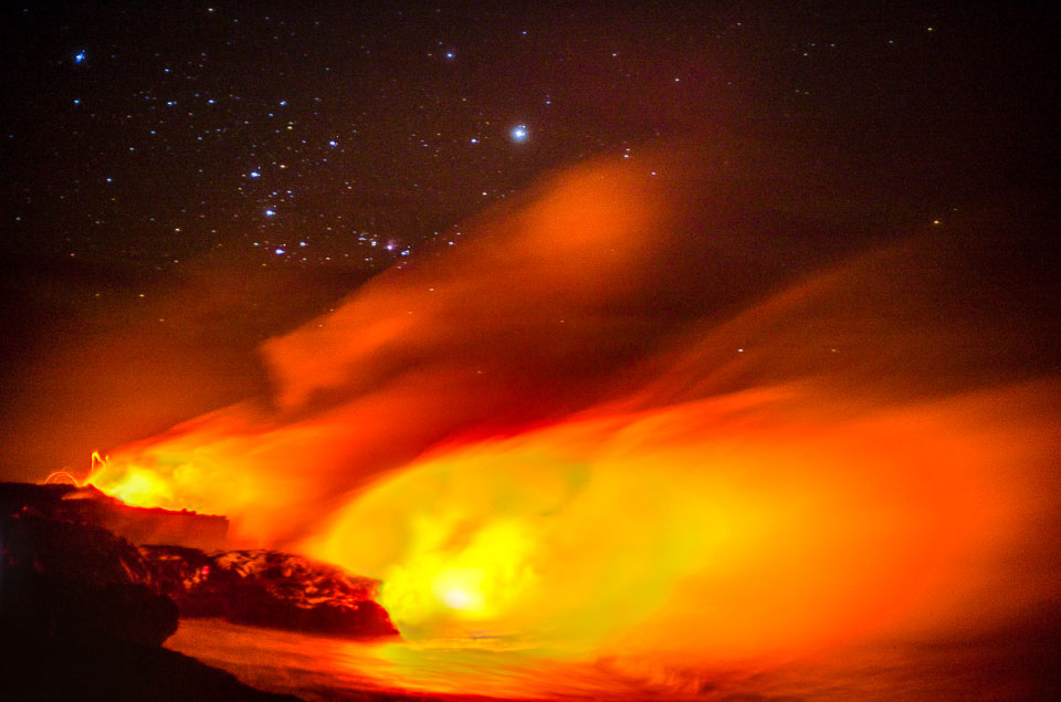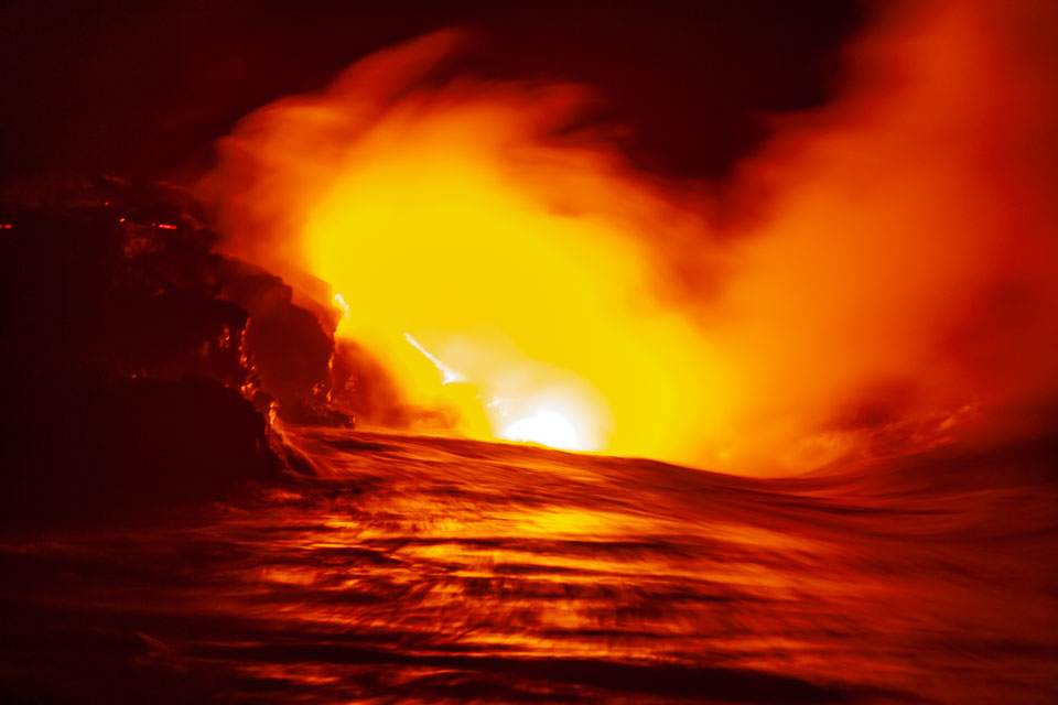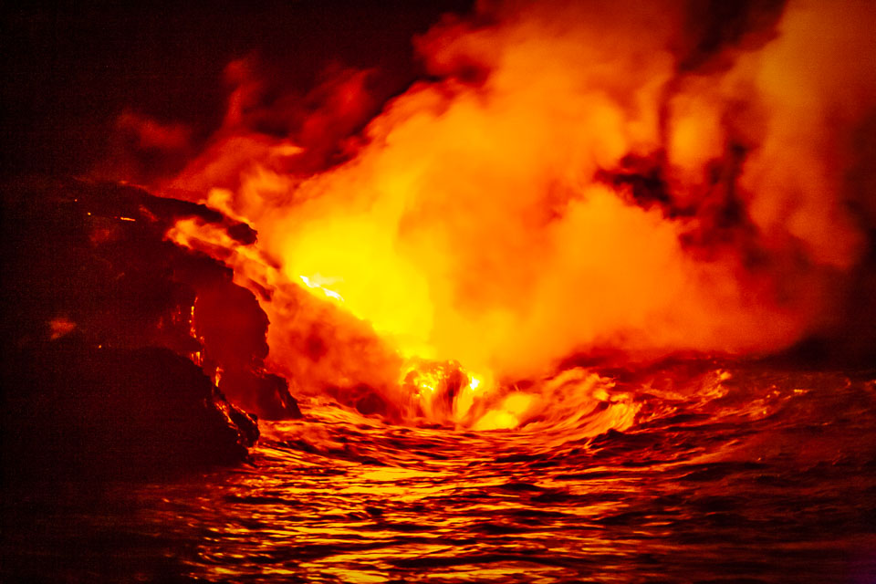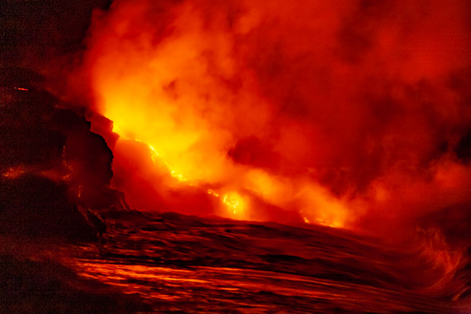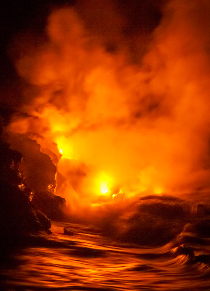 Images of lava; earth air fire and water. From the Kalapana subdivisions area, Kalapana bay ocean entry (a night hike over and active lava tube to then see the lave we walked over entering the sea) and the Halemaʻumaʻu lava pool at he Kīlauea summit